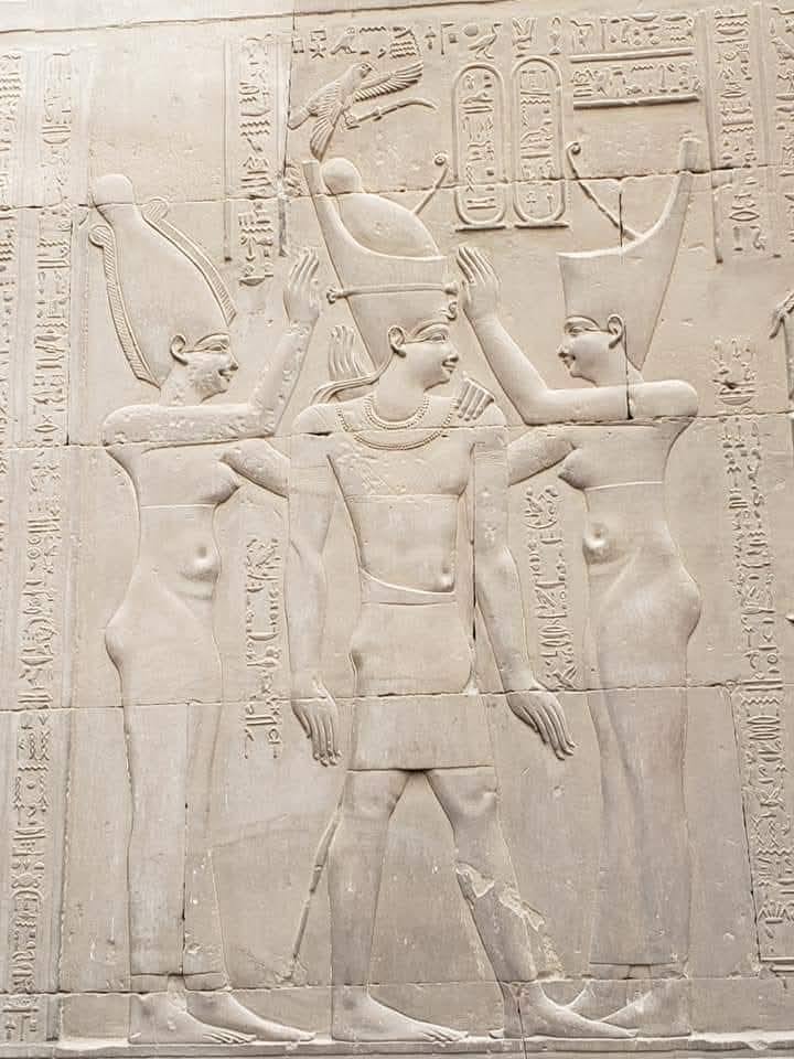 In the embossed relief below, the Goddesses of Upper and Lower Egypt are giving adoration to King Ptolemy the whatevereth. Notice anything wrong?? I didn’t when we were gazing up at this depiction, but the King has 2 left hands!